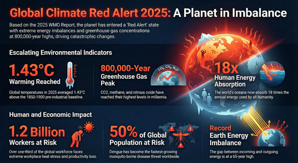 The World Meteorological Organization (WMO) released its State of the Global Climate Report 2025 on the occasion of World Meteorological Day, warning that the planet is now in a “state of emergency” due to a record Earth energy imbalance, rising temperatures, and intensifying climate impacts.